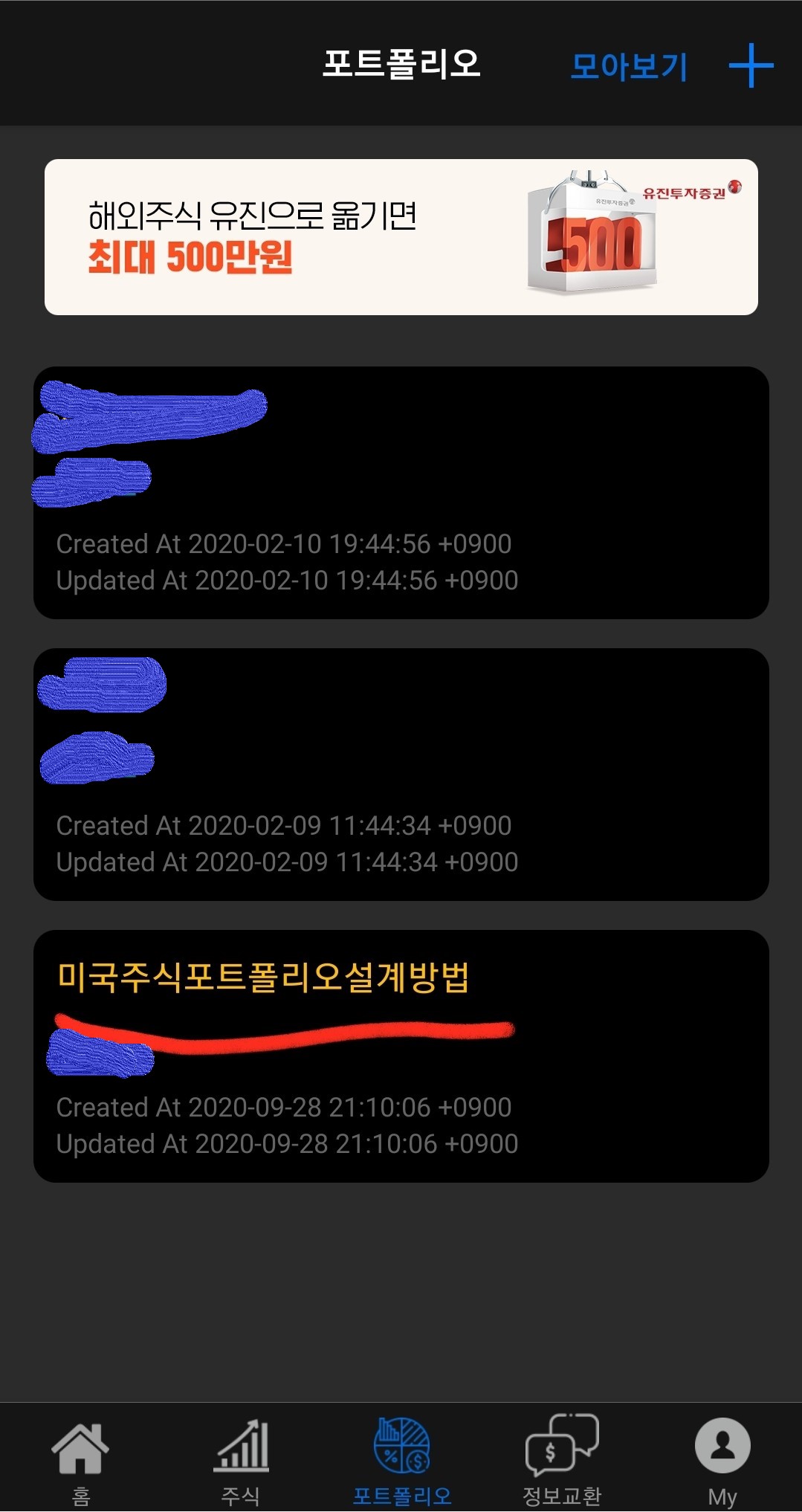 포트폴리오 종목을 손으로 터치하신 후 왼쪽으로 밀어주시면 수정 삭제 버튼이 나와요.