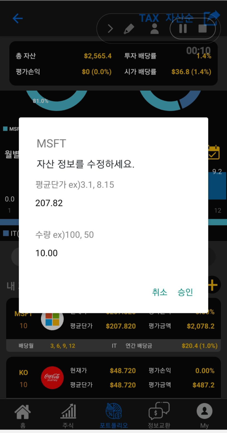 9. 이제 평균 단가와 수량을 입력해주시면 포트폴리오에 등록이 됩니다.