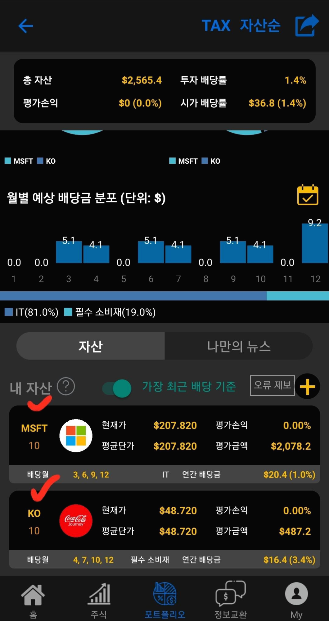 빨간 화살표를 봐주시면 코카콜라 주식 10개 총자산과 총투자금액에 배당률과 월마다 들어오는 배당금 금액을 확인을 하실 수가 있어요.